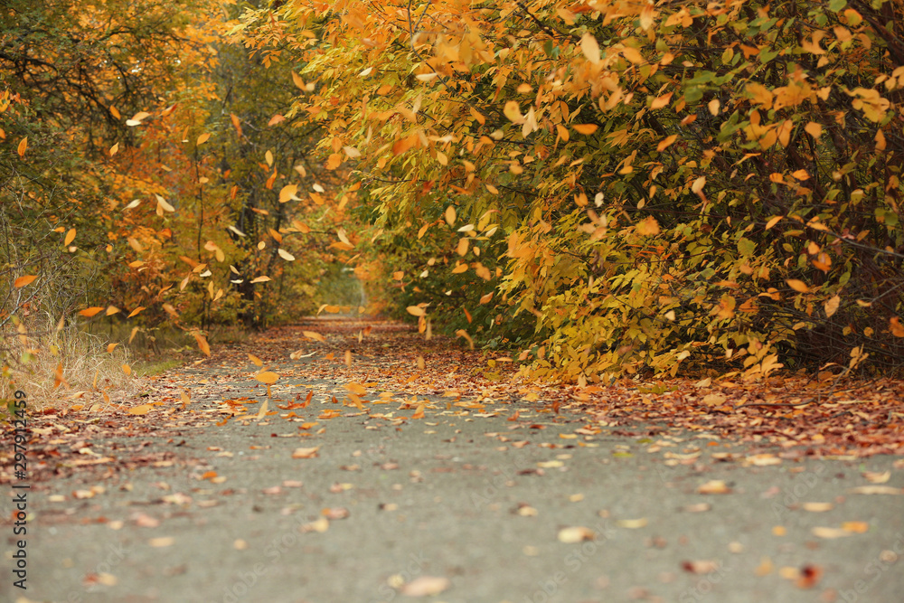Samolepka Trees and bushes with colorful leaves near rural road on autumn day