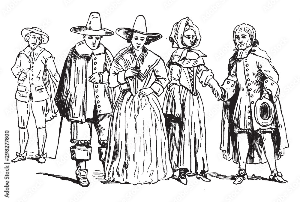Samolepka Puritans in mid 17th century, vintage illustration.