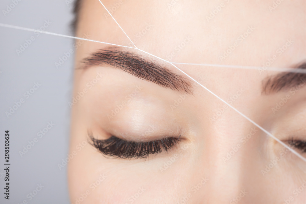 Samolepka The make-up artist plucks eyebrows with a thread close-up