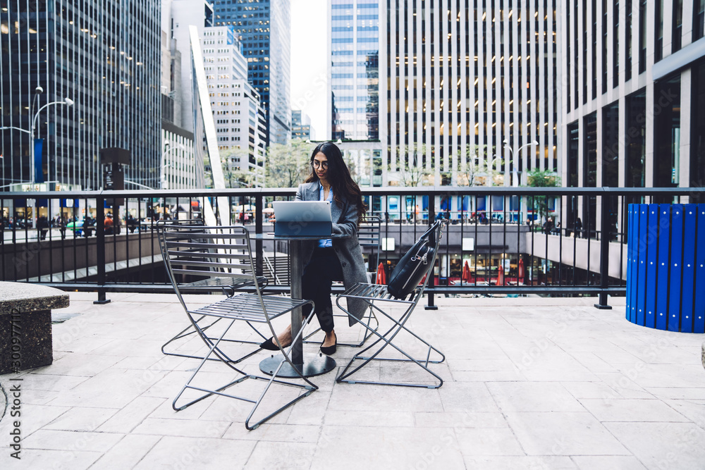 Samolepka Ethnic woman working on tablet on New York city background
