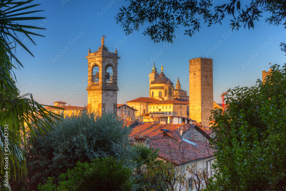 Samolepka Beautiful towers of the Citta Alta in Bergamo at sunrise, Italy