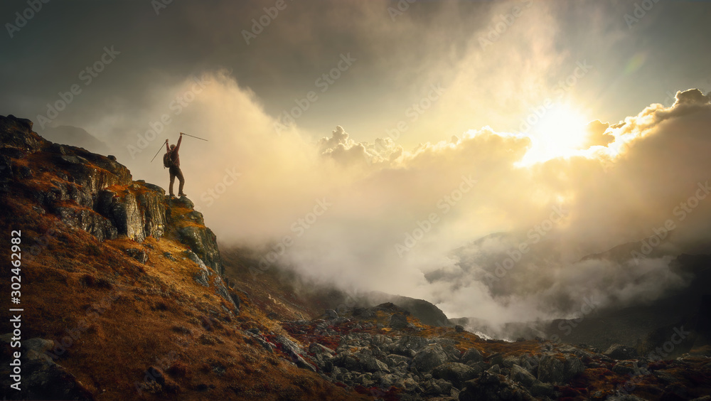 Samolepka traveller in mountains with a backpack and trekking poles rejoices at the top during a beautiful sunset in the Himalayas