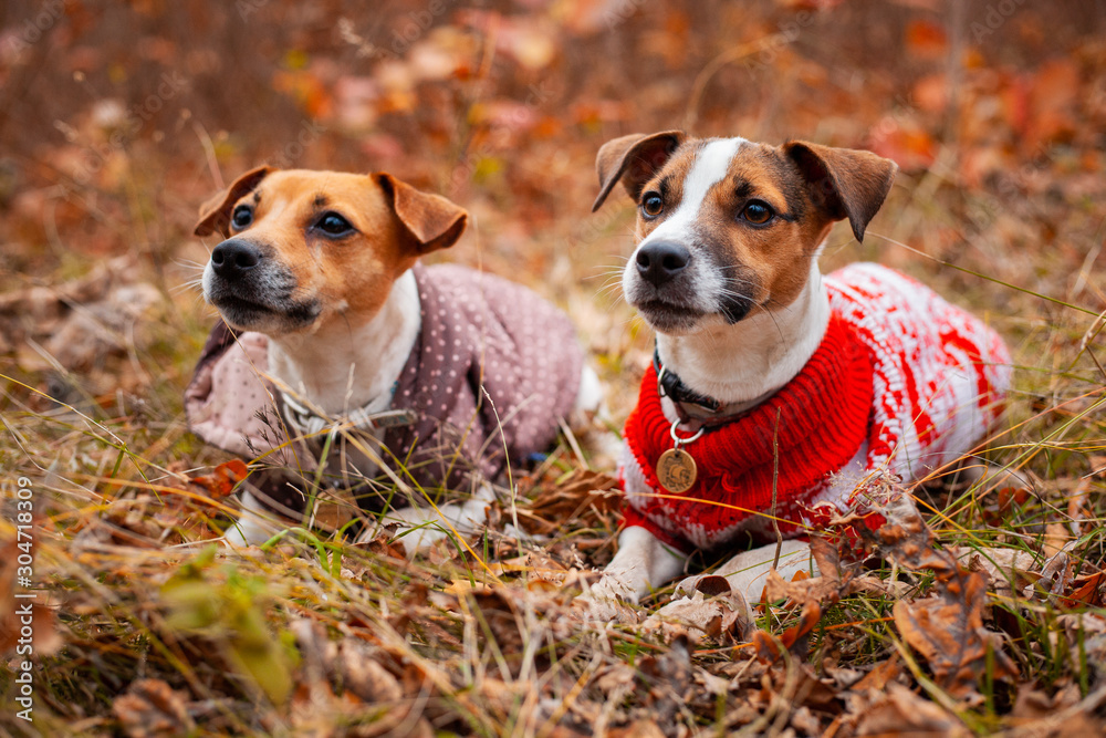 Samolepka Two Jack Russell Terrier dogs in clothes on the lawn in the autumn forest