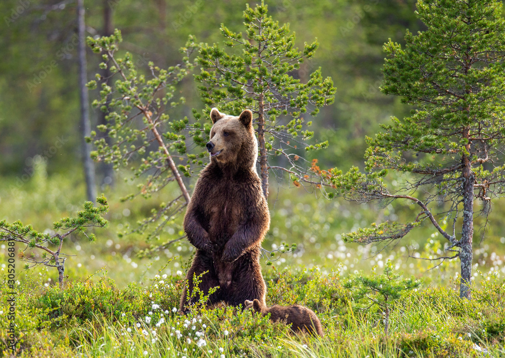 Samolepka Brown bear in a forest glade is standing on its hind legs