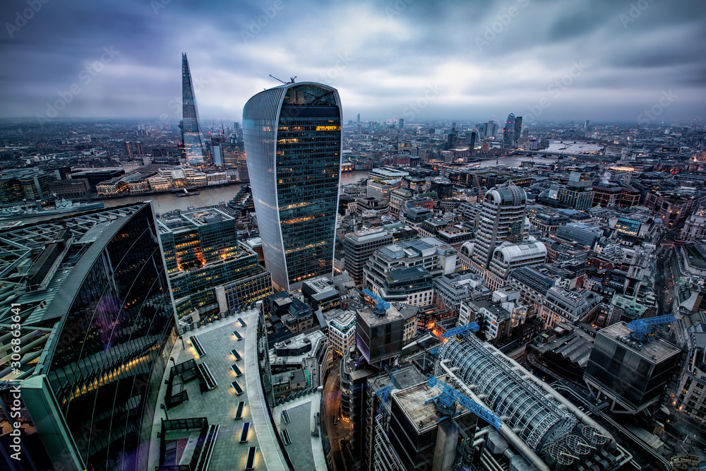 Samolepka Blick auf die Skyline von London mit den modernen Bürogebäuden an einem wolkigem