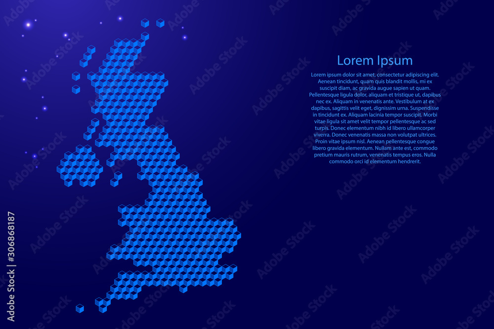 Samolepka United Kingdom map from 3D blue cubes isometric abstract concept, square pattern, angular geometric shape, glowing stars