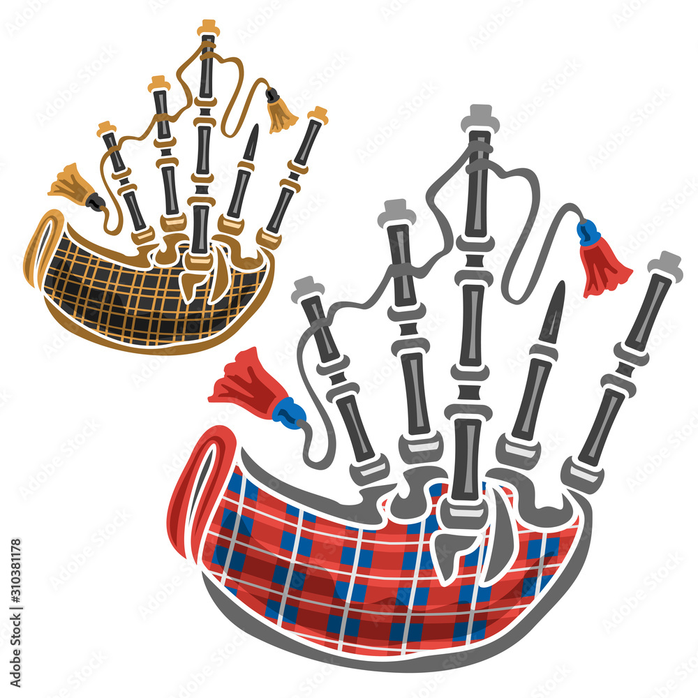 Samolepka Vector set of scottish Bagpipes, 2 cut out illustrations of classical different bagpipes leather and red tartan on white background