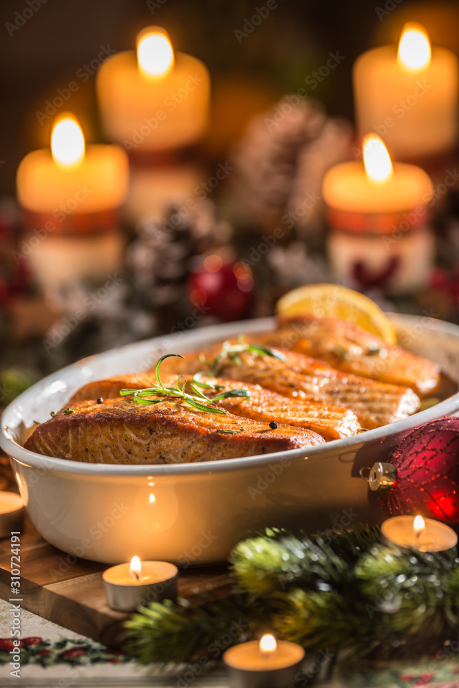 Samolepka Christmas dinner from fish salmon in roasting dish with festive decoration advent wreath and candles