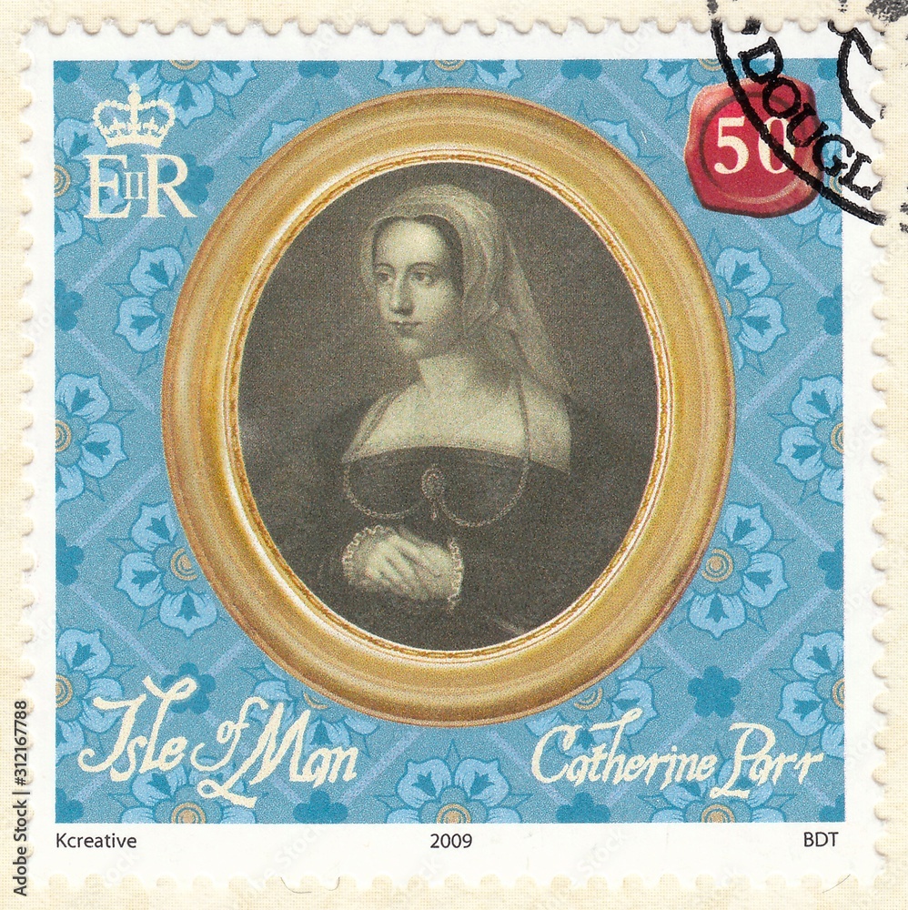Samolepka Catherine Parr-sixth wife of king Henry VIII Tudor of England, stamp Isle of Man