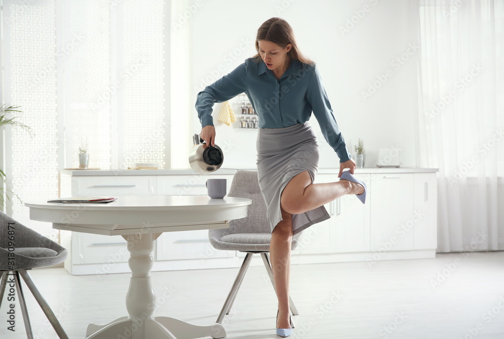 Samolepka Young woman pouring coffee into cup while putting on shoes at home in morning