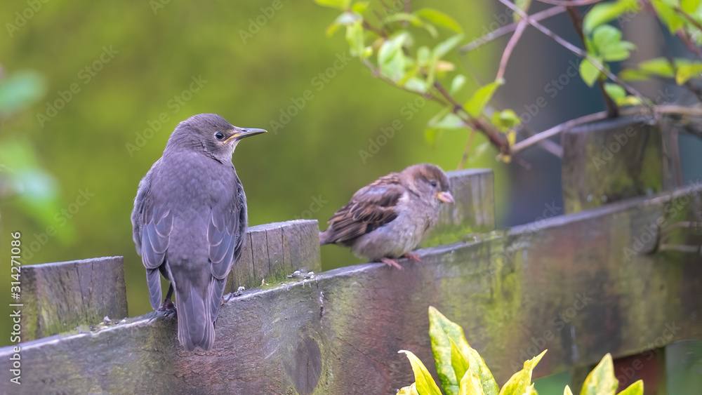 Samolepka Starling fledgling on a wooden fence with a sparrow