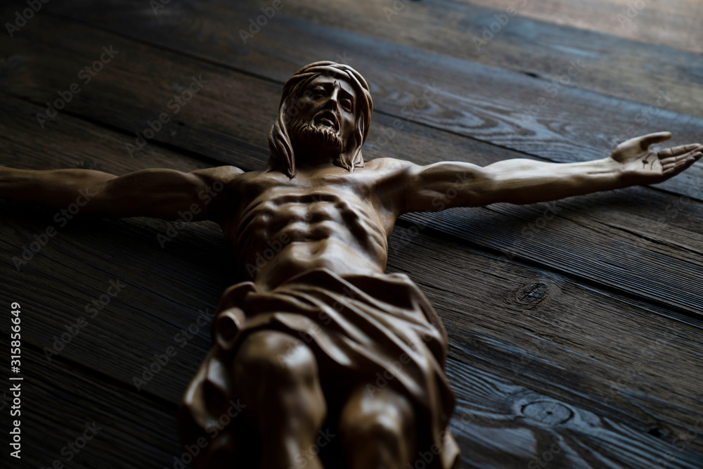 Samolepka Cruciefied Jesus figure isolated on rustic dark brown table.