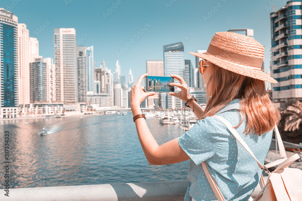 Samolepka Happy Asian tourist girl taking photos in popular Marina district in Dubai for h