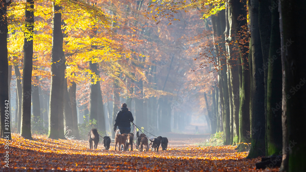 Samolepka many dogs on leash in autumnal forest near utrecht in holland