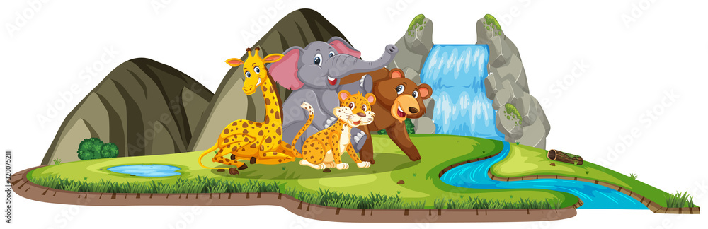 Samolepka Scene with many wild animals by the waterfall