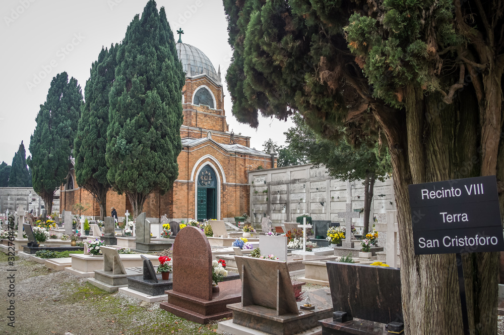 Samolepka Inside the cemetery of Venice, with small church. Italy, Europe.