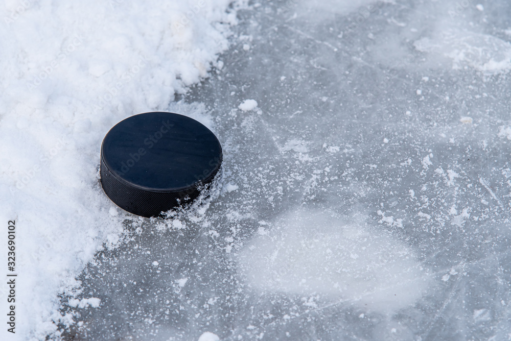Samolepka hockey puck lies on the snow close-up