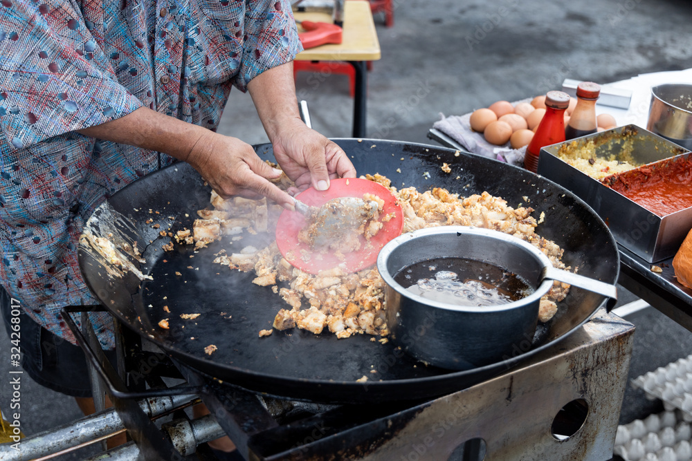 Samolepka Malaysian hawker cooking frying radish carrot cake with egg in wok