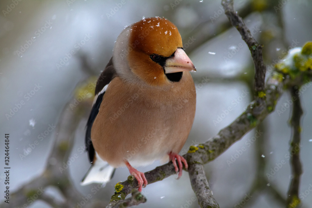 Samolepka Portrait of the hawfinch (Coccothraustes coccothraustes) on the branch in winter