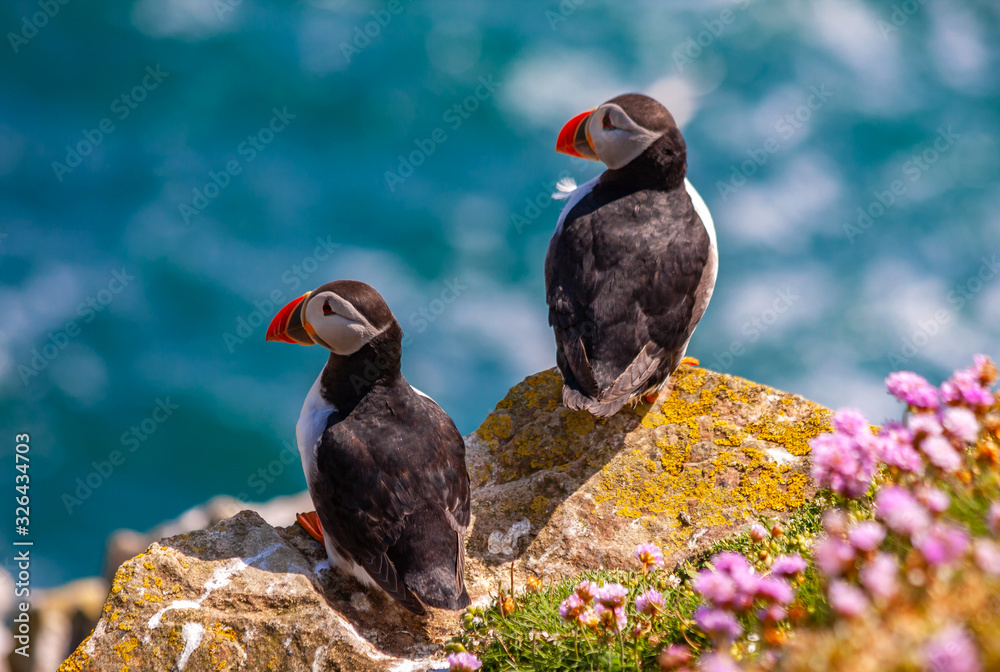 Samolepka Atlantic puffins (Fratercula arctica) two on rocks looking out to sparkling blue sea ocean