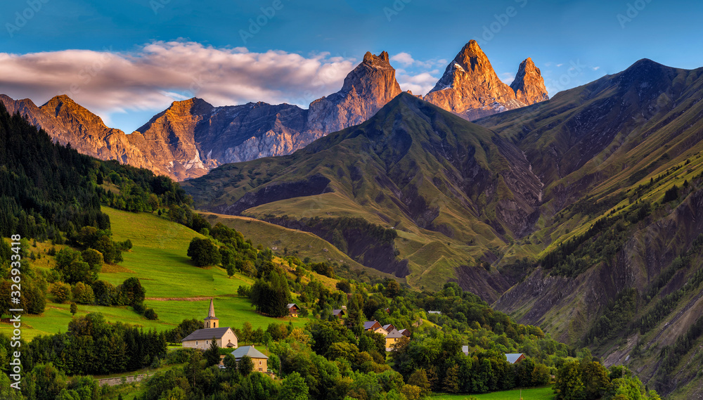 Samolepka church in a village in the french alps with mountains 3000 meters high