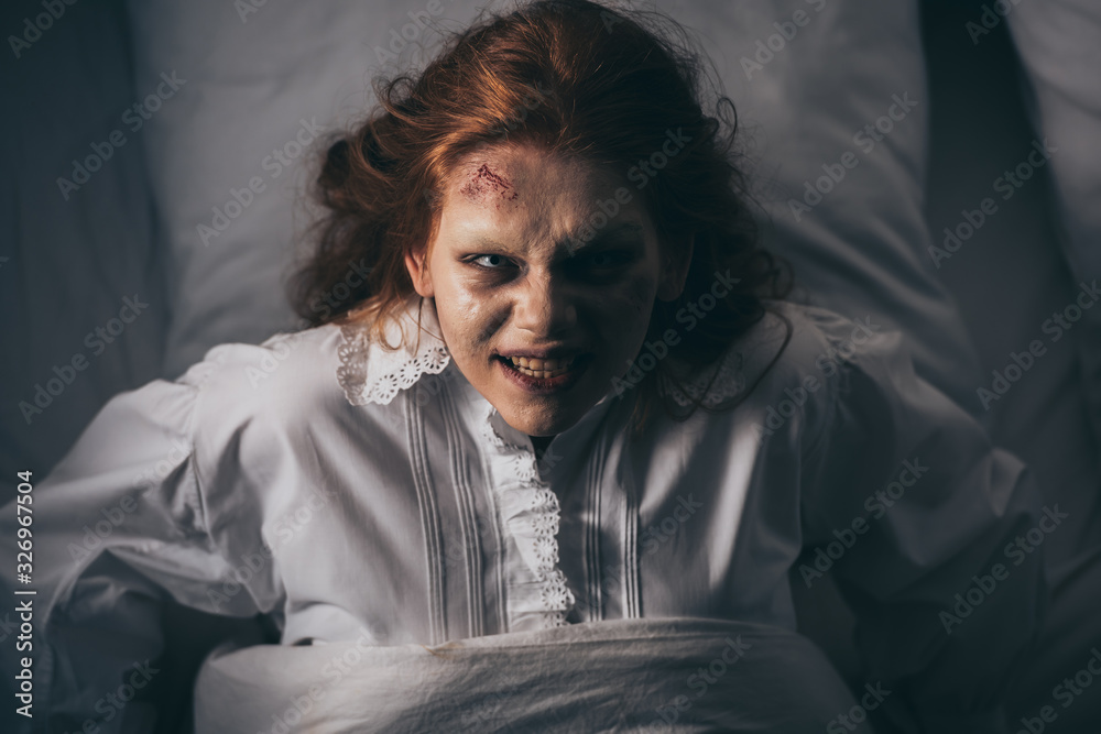 Samolepka top view of paranormal girl in nightgown lying in bed