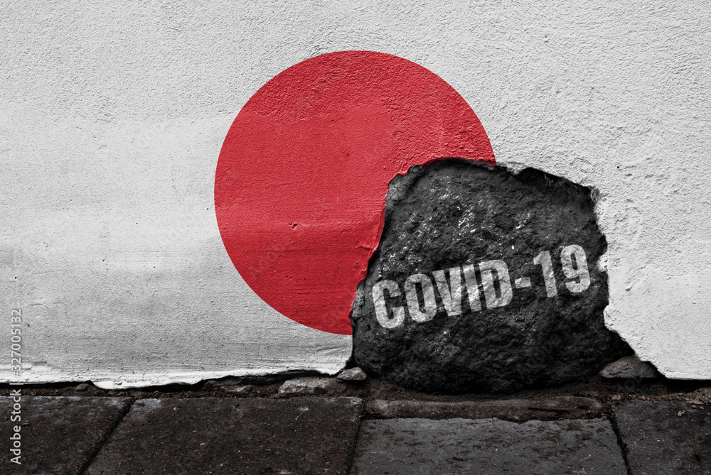 Samolepka Flag of Japan on the wall with cracked stone with Coronavirus name on it