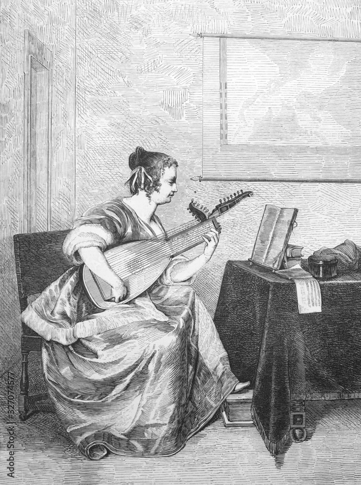 Samolepka Picture of a woman playing the lute in the old book Des Peintres, by C
