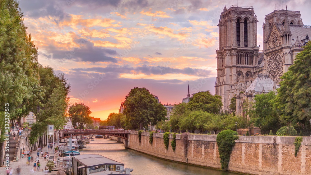 Samolepka Sunset view of Cathedral Notre Dame de Paris timelapse in Paris, France