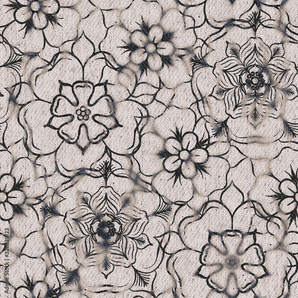 Samolepka Seaumless neutral worn faded western white denim jean texture with tudor rose floral pattern overlay