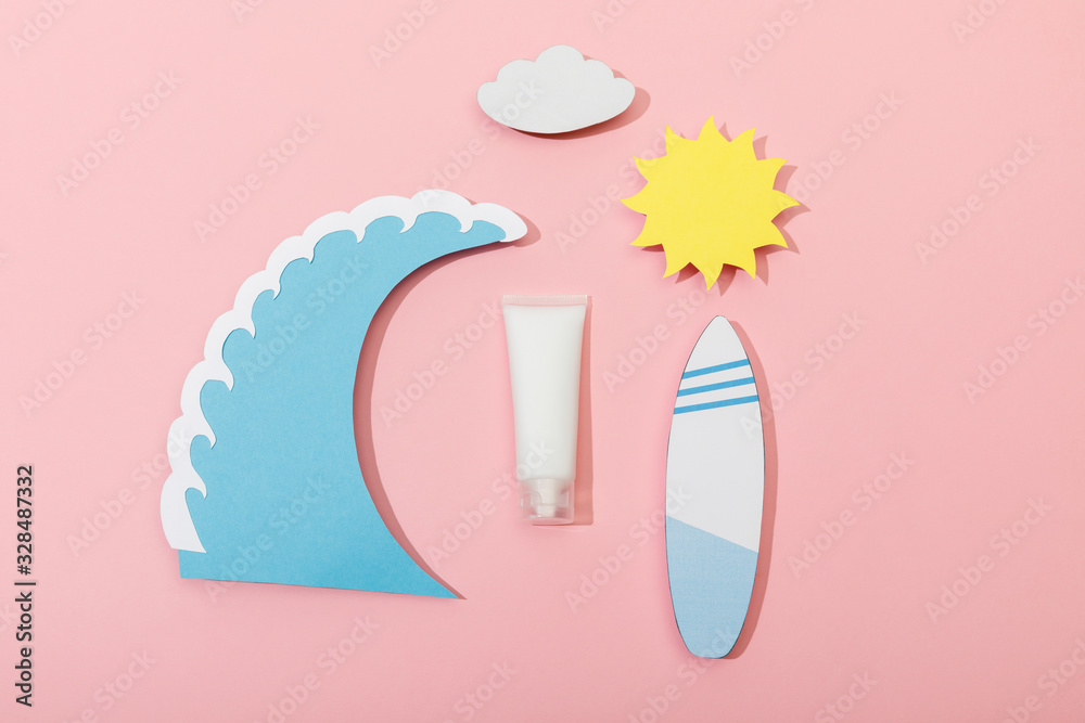 Samolepka Top view of paper cut sun, cloud, sea wave and surfboard with tube of sunscreen