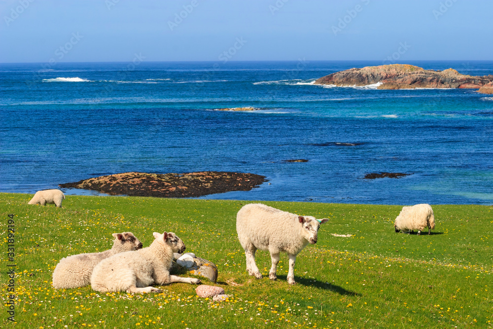 Samolepka Beautiful view of the sea and sheeps on a meadow in Iona, Scotland