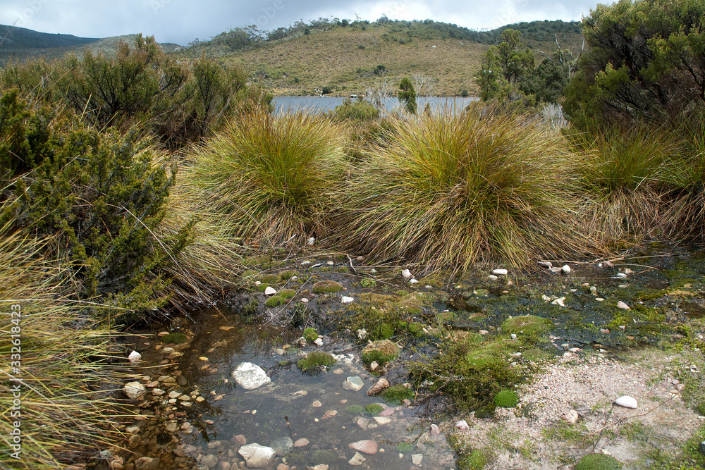 Samolepka Cradle Mountain Tasmania, button grass surrounded by water with lake in backgrou