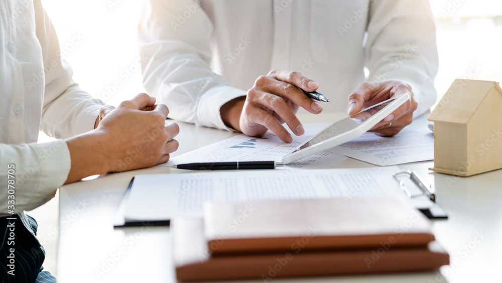 Samolepka Real Estate Agent broker or House developer showing contract for buying house agreement to consultant employee