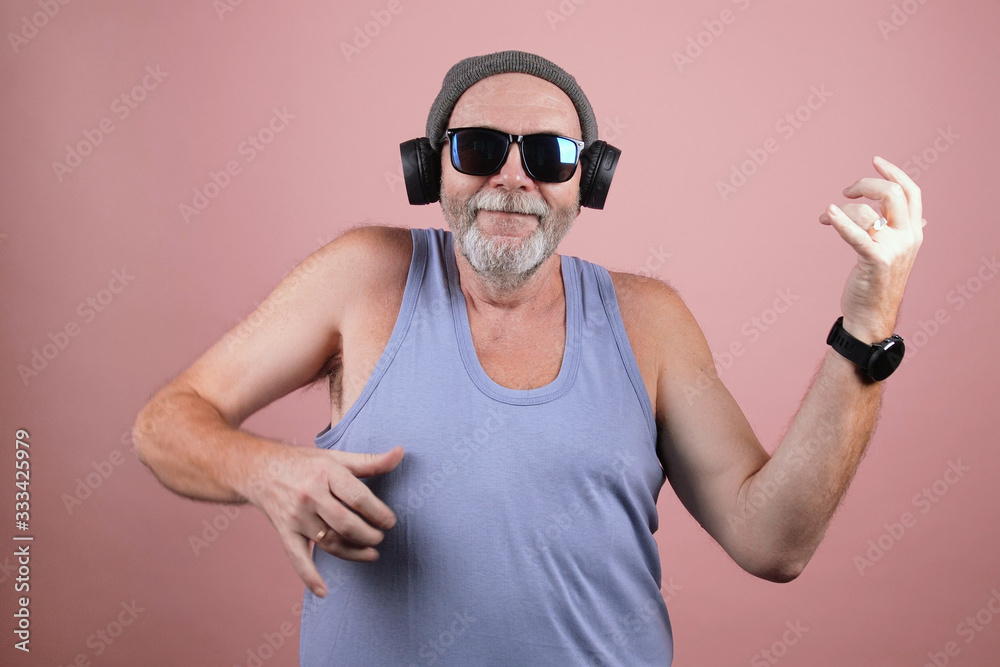 Samolepka A hipster aged man in grey hat, blue tank top, sunglasses and headphones playing vigorously on an imaginary guitar