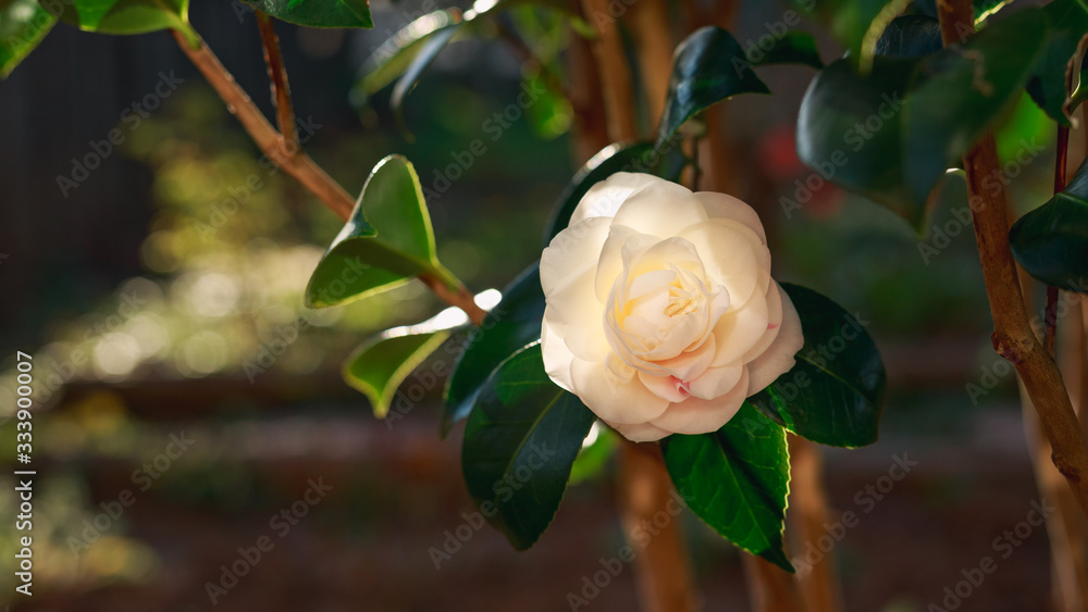 Samolepka beautiful detail of the camelia flower on the bush in spring garden