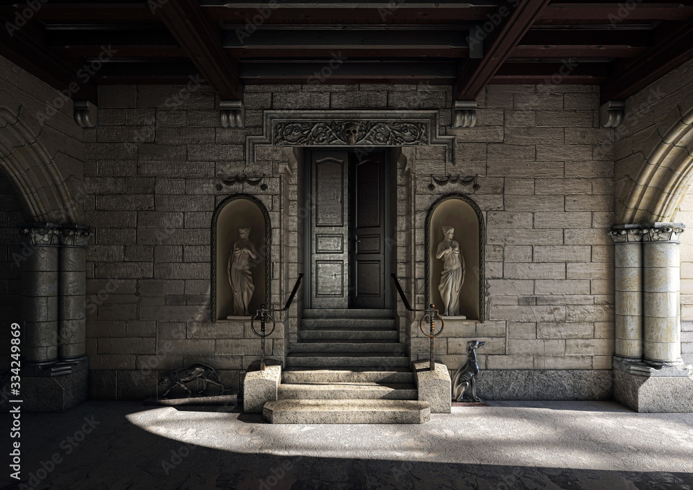 Samolepka Monumental entrance with ancient wooden gothic doorway with sculptures, 3d rende