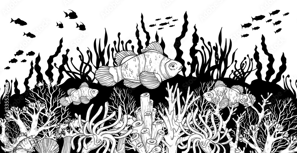 Samolepka Hand drawn Clown fish in sea anemones coral reef, oceanic animal