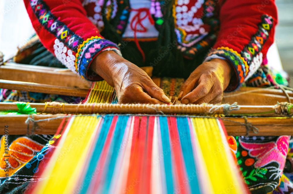 Samolepka Peruvian indigenous Quechua woman weaving a textile with the traditional techniques in Cusco, Peru