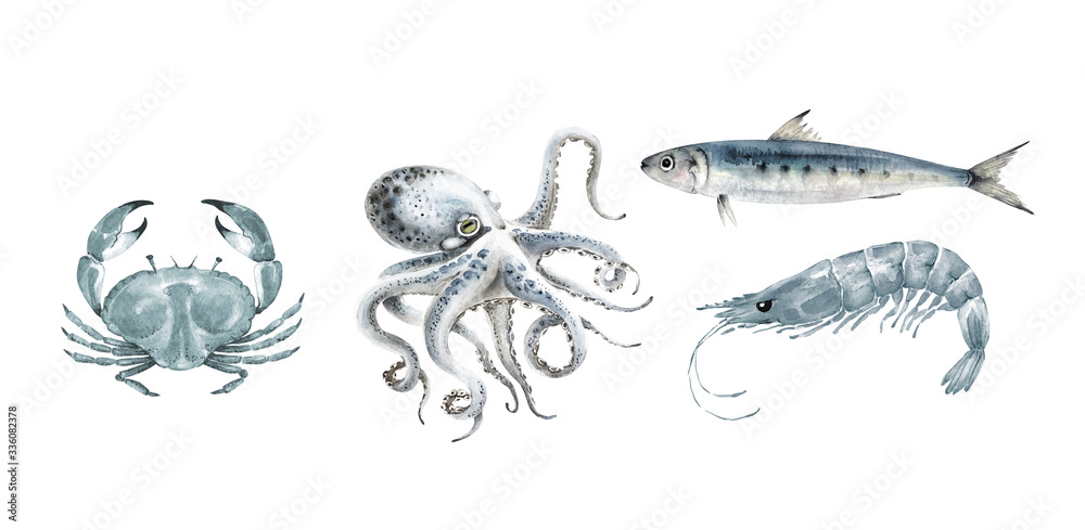 Samolepka Set of watercolor illustrations with sea inhabitants