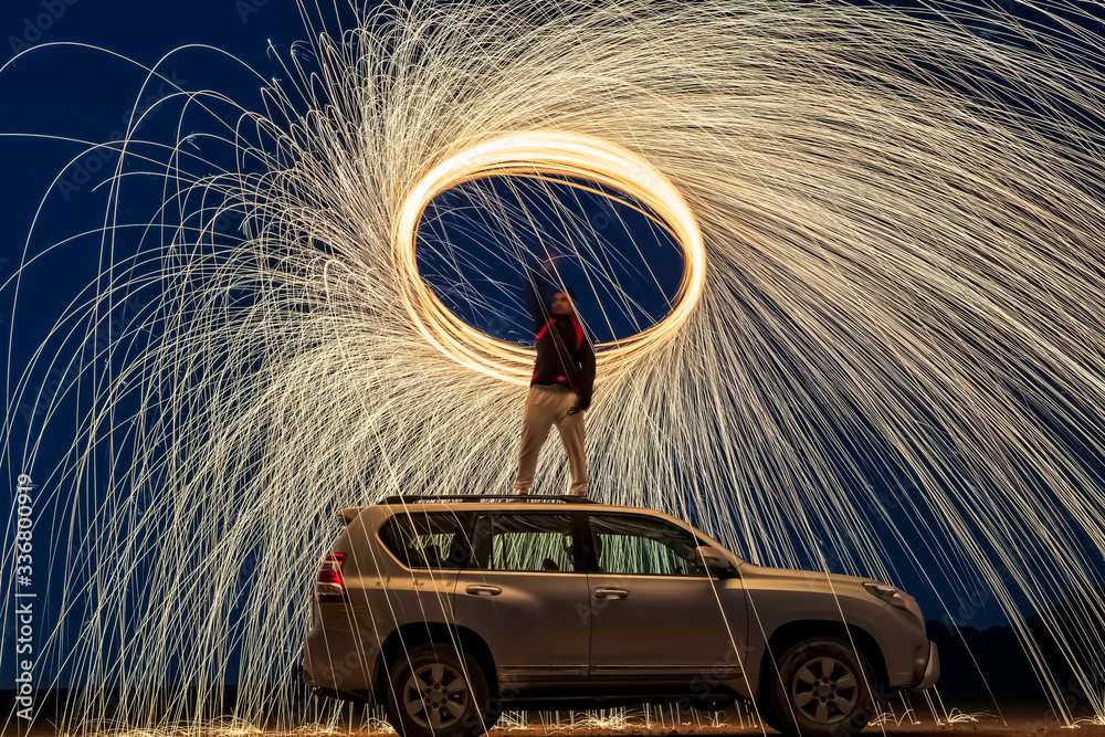 Samolepka A steel wool on fire at night (night photography using a slow shutter speed) - selective focused
