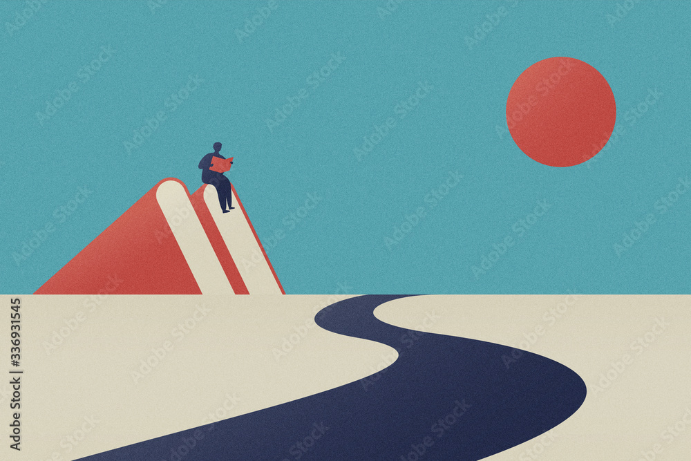 Diligence is the path to the mountain of knowledge. A man is reading on the mountain and a road towards the sky.