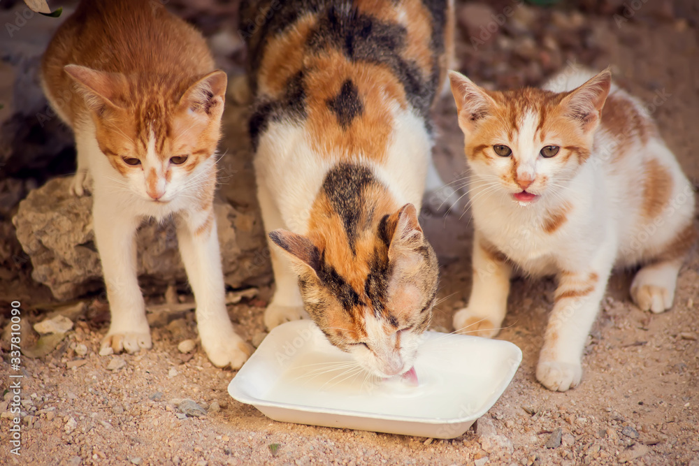 Samolepka Stray cats eating food on the street. Pet protection concept