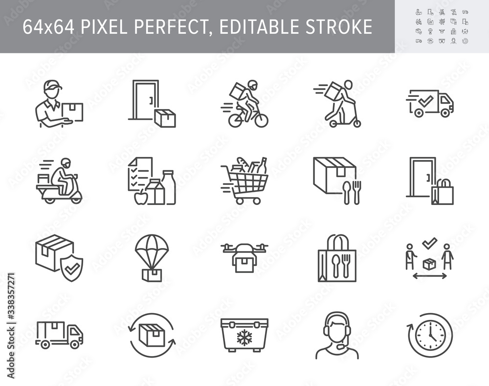 Food delivery line icons. Vector illustration included icon as coutier on bike, door contactless delivering, grocery list outline pictogram for fast distribution. 64x64 Pixel Perfect Editable Stroke