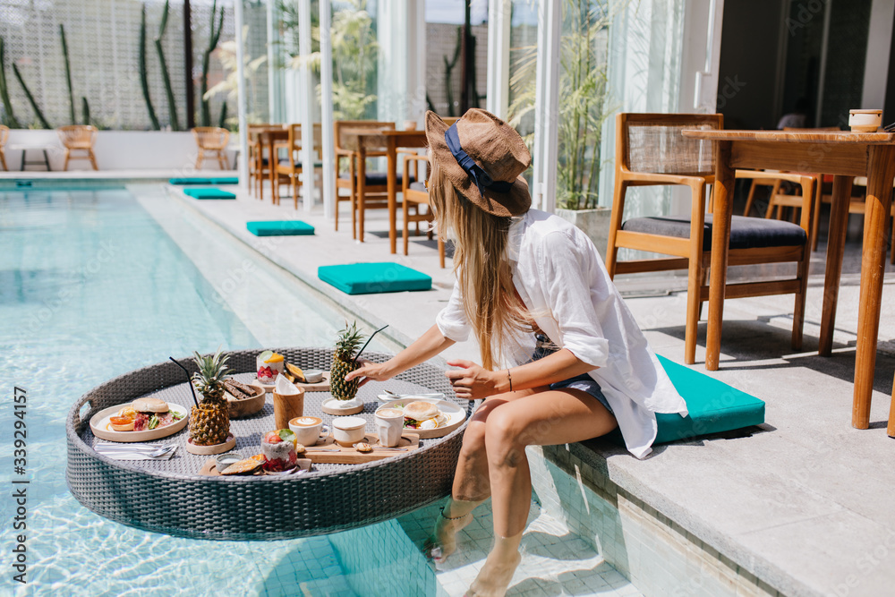 Samolepka Slim girl in elegant brown hat eating juicy fruits at resort cafe