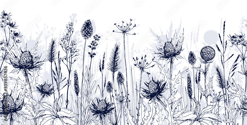Samolepka Seamless horizontal background with blue thistles, wild herbs and flowers