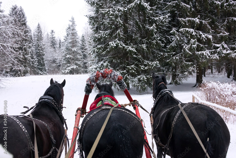 Samolepka Russian Troika, three horses harnessed to a sleigh, download through the winter