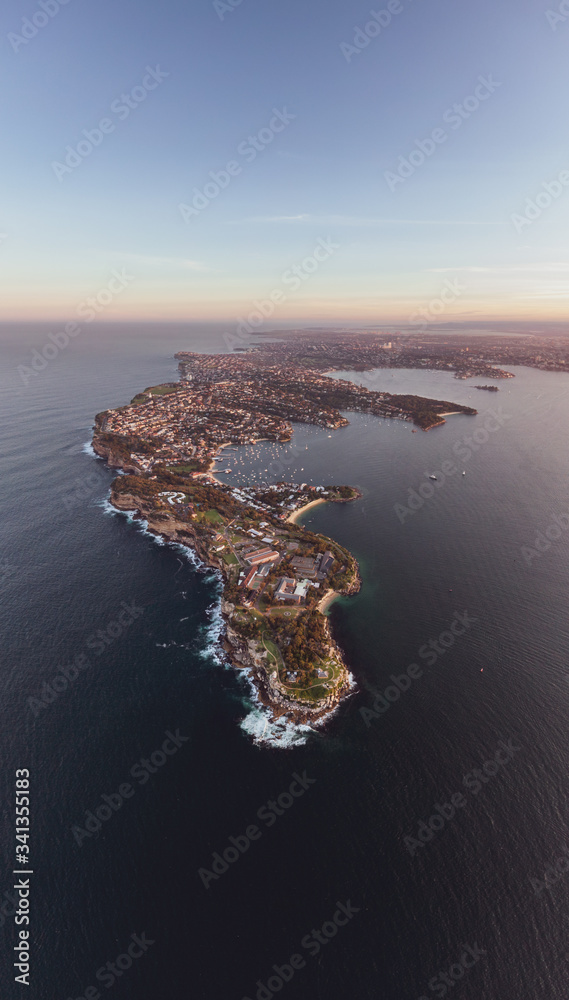 Samolepka XXL panoramic sunset aerial drone view looking south to South Head, a headland & part of Sydney Harbour National Park, to the north of the suburb of Watsons Bay in Sydney, New South Wales, Australia