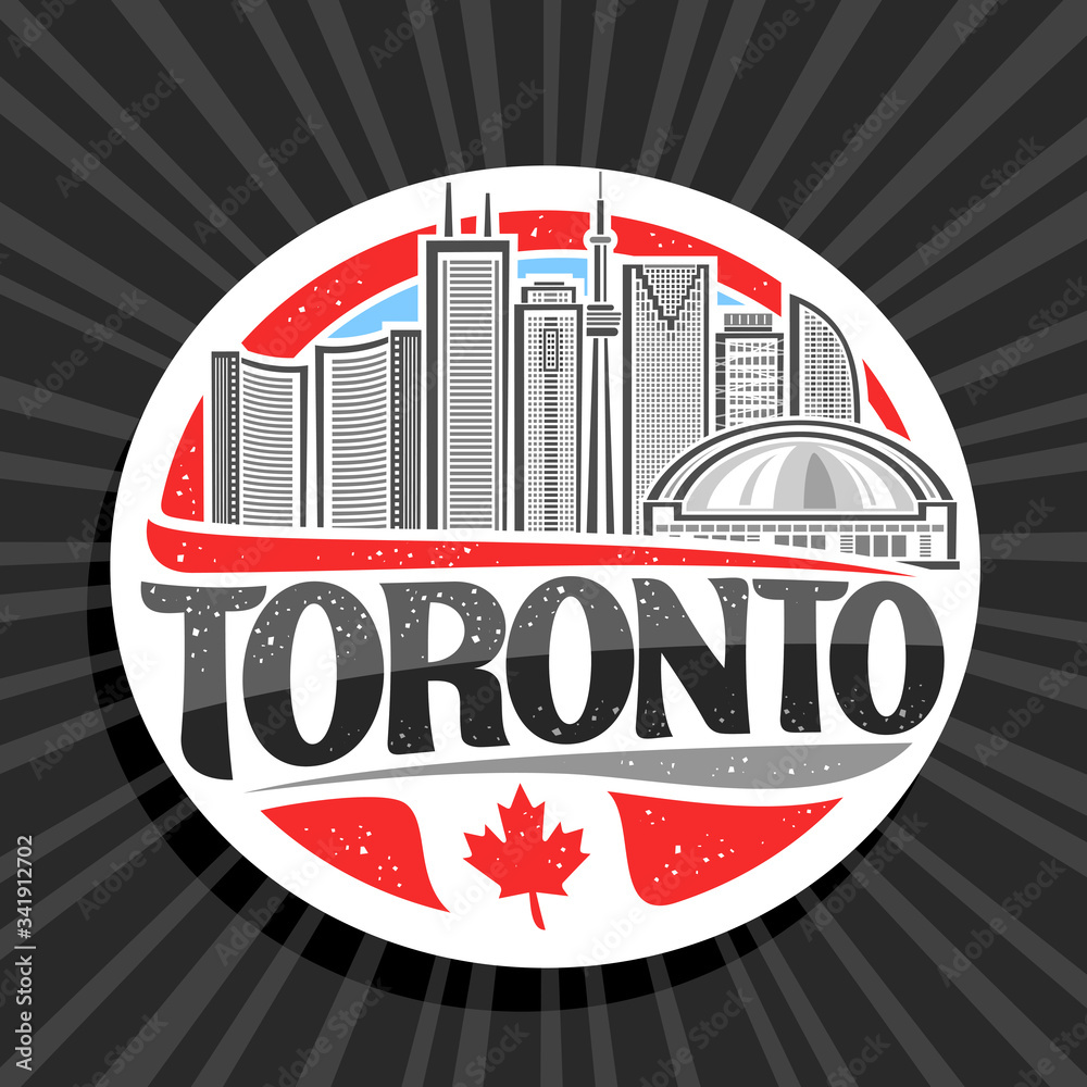 Samolepka Vector logo for Toronto, white decorative round tag with line illustration of modern toronto city scape on day sky background, design tourist fridge magnet with unique letters for black word toronto