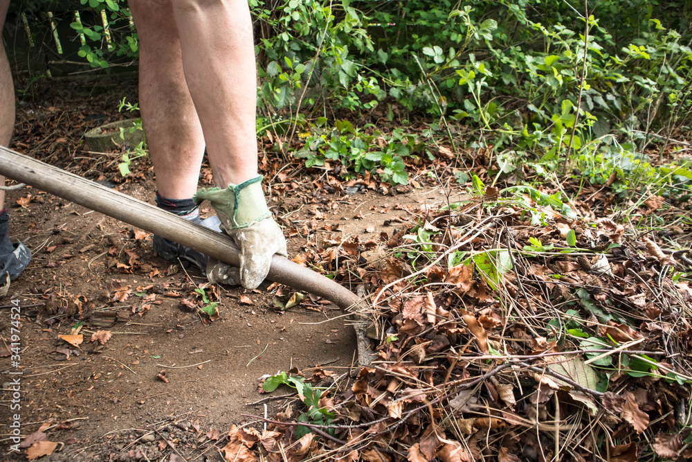 Samolepka Man shovelling garden waste leaves with a shovel